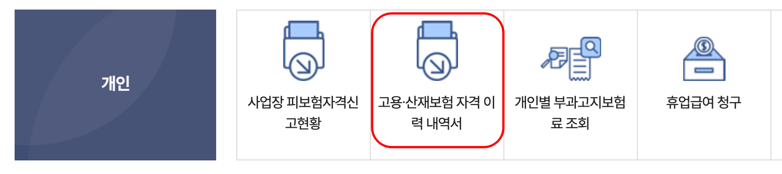 : 근로복지공단 홈페이지에 들어가면 [개인] 메뉴 중, [고용.산재보험 자격 이력 내역서]가 있습니다. 이 메뉴를 선택해주세요.