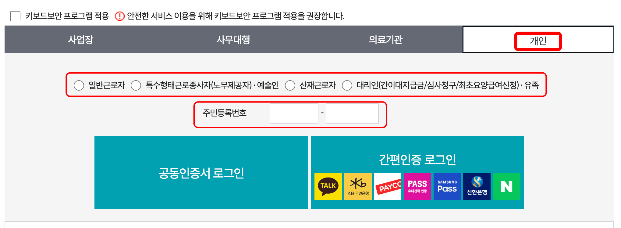개인 선택 후, 일반근로자인지도 상세 항목 체크도 해주신 후, 주민등록번호를 입력하고 인증서 로그인을 진행합니다.