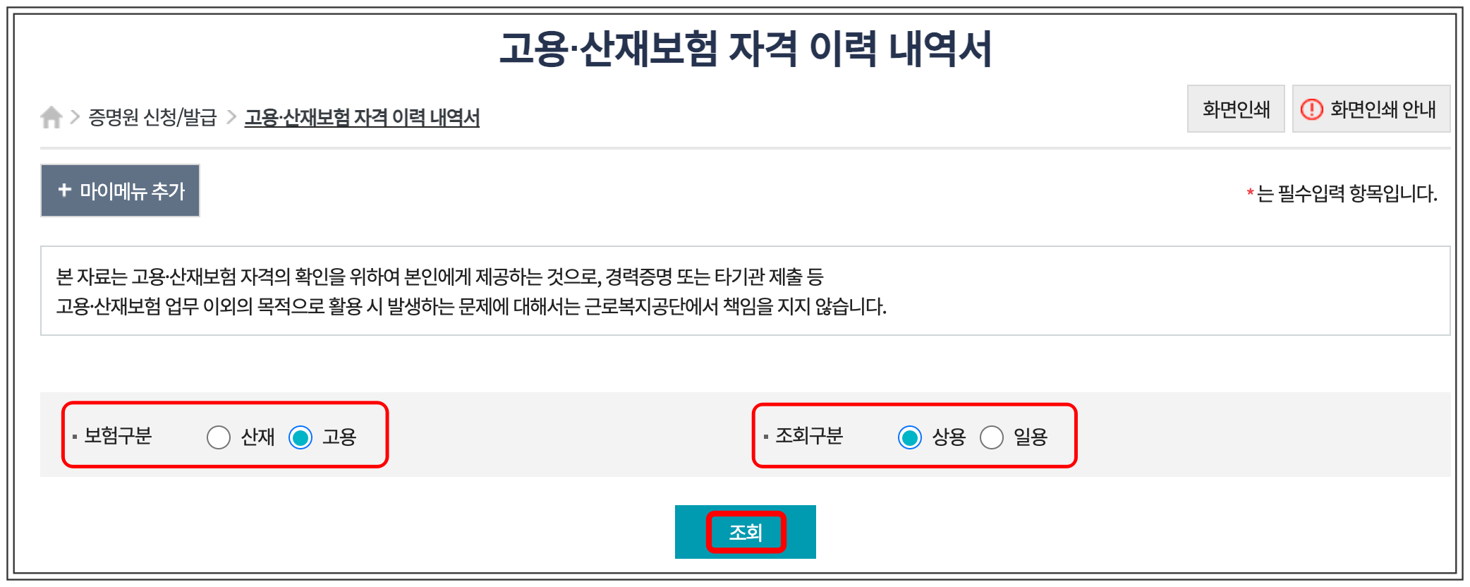 3. 고용.산재보험 자격 이력 내역서 선택 및 조회