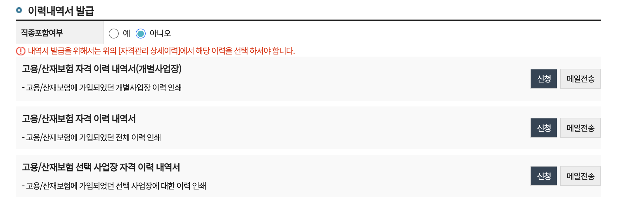 이력을 확인 후에 하단에 있는 개별사업장 이력 / 전체 이력 / 선택 이력 중 원하는 이력을 선택하여 신청하면 됩니다.