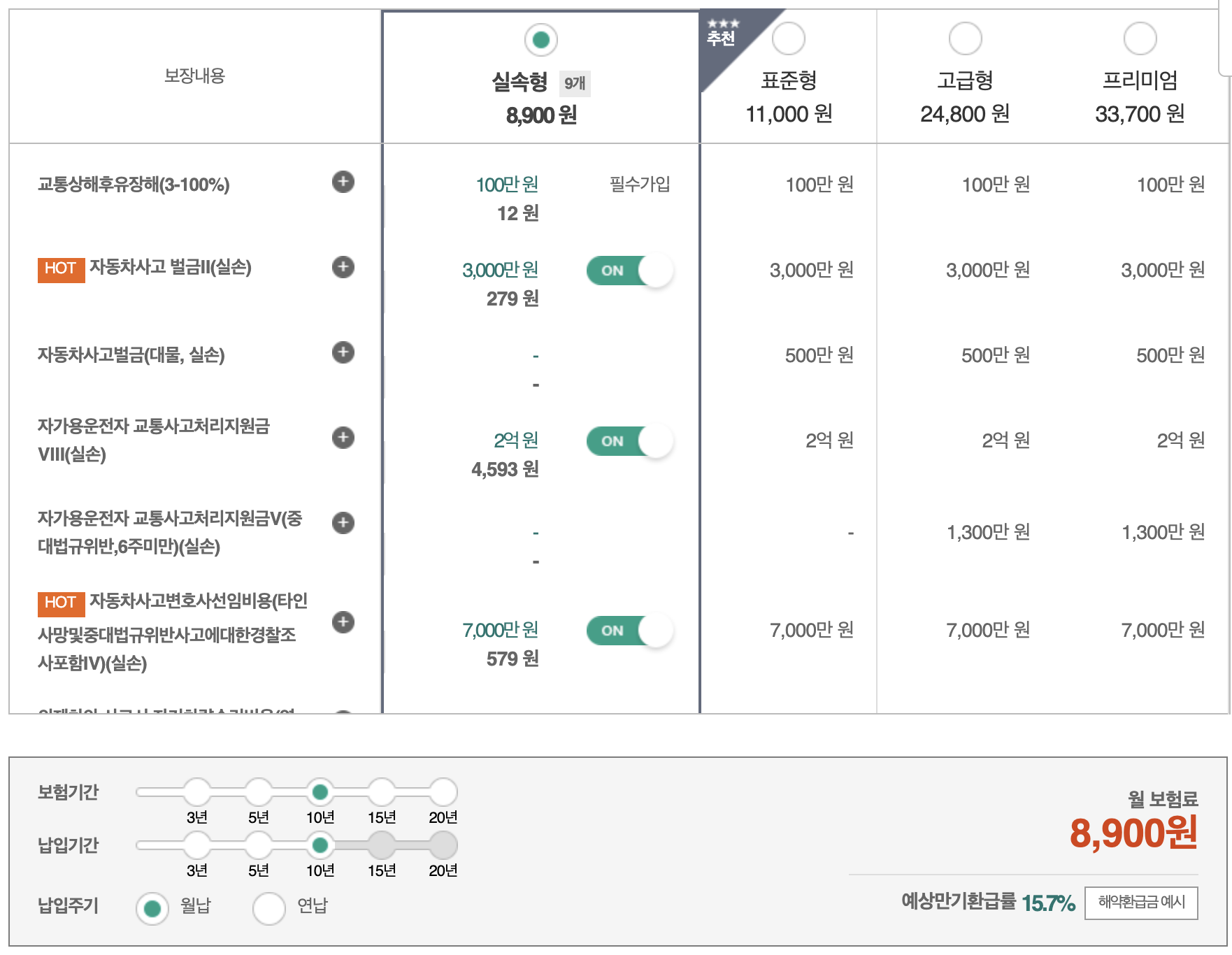 DB손해보험 다이렉트 운전자보험 알아보겠습니다. 실속형 8,900원, 표준형 11,000원, 고급형 24,800원, 프리미엄 33,700원으로 구성되 있습니다.