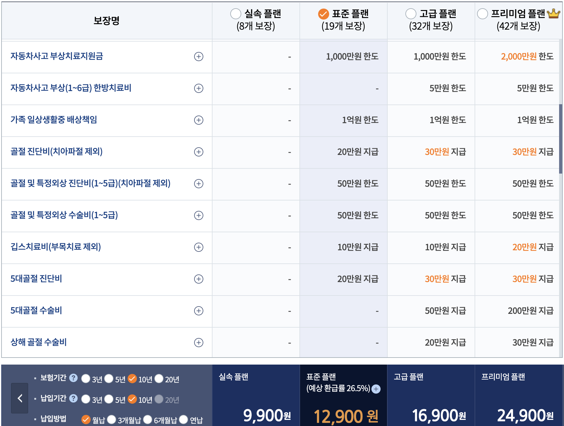 기타 특약사항을 살펴보시고 어떤 특약을 추가하고, 보장 금액이 어떠냐에 따라 실속-표준-고급-프리미엄으로 나뉘게 됩니다.