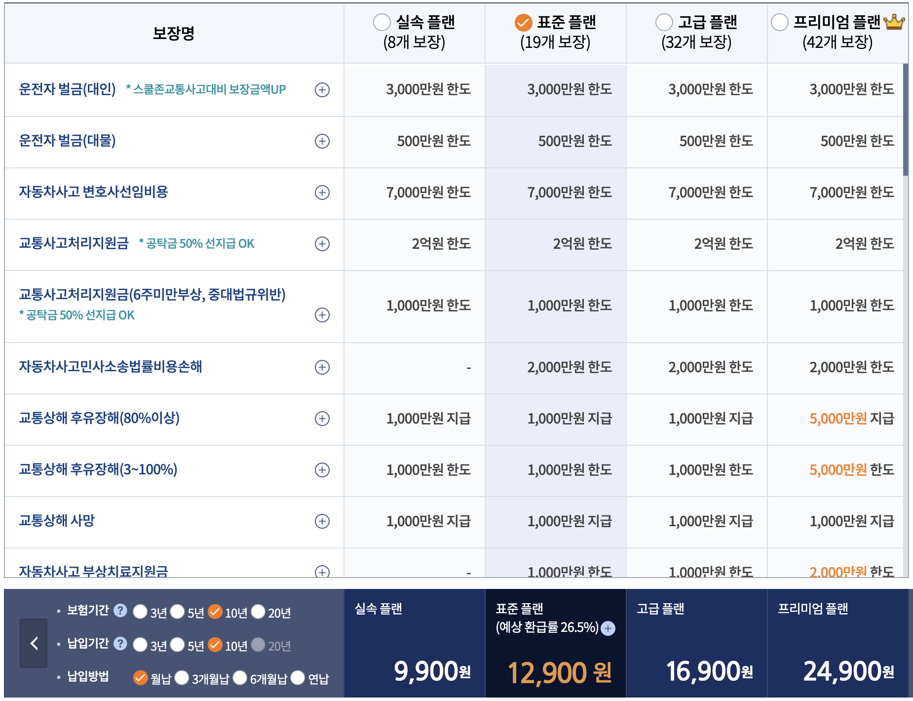 자동차사고 부상치료지원금, 가족 일상생활중 배상책임, 골절, 깁스 등의 특약을 추가할 경우 표준 플랜으로 한달 보험료는 12,900원이 됩니다. 각각의 특약의 보상금액에 따라 그리고 특약 추가에 따라 가격이 달라집니다.